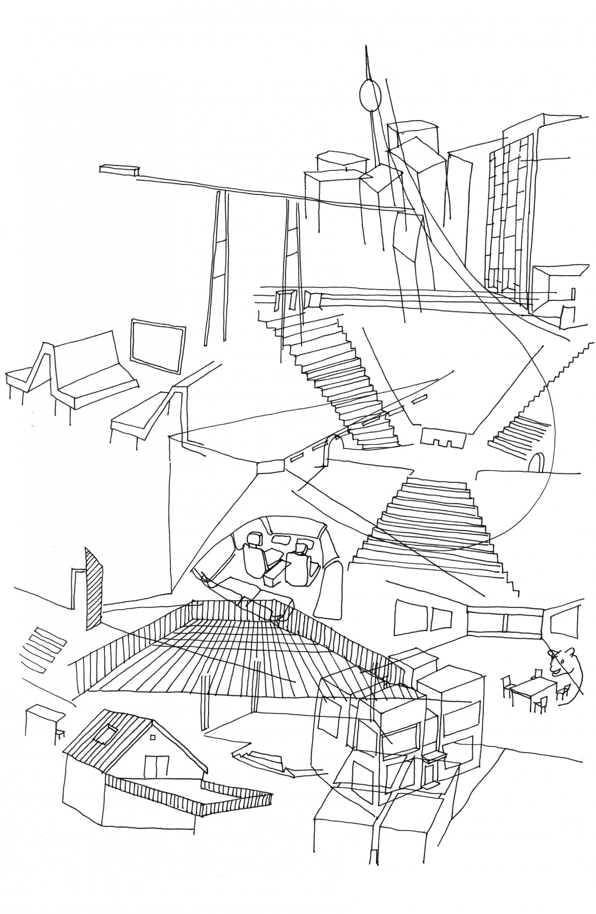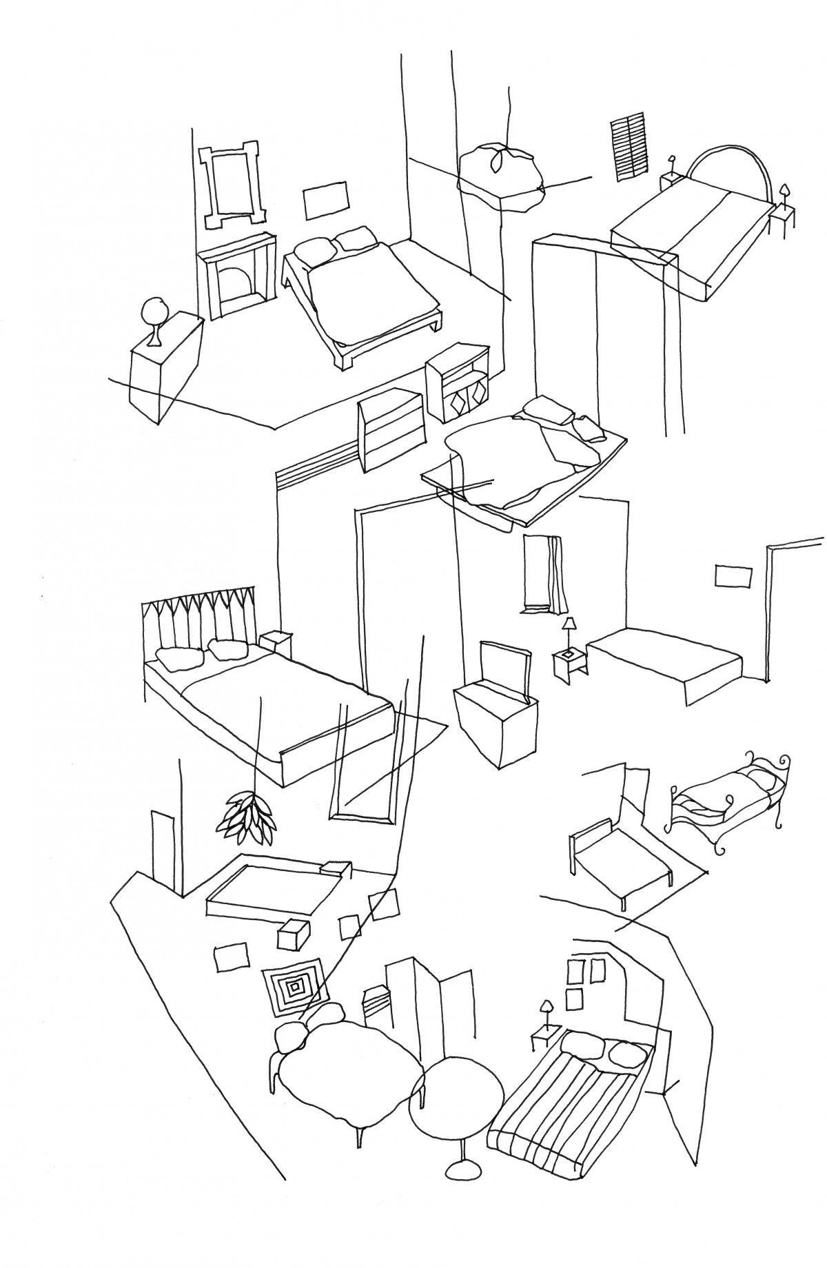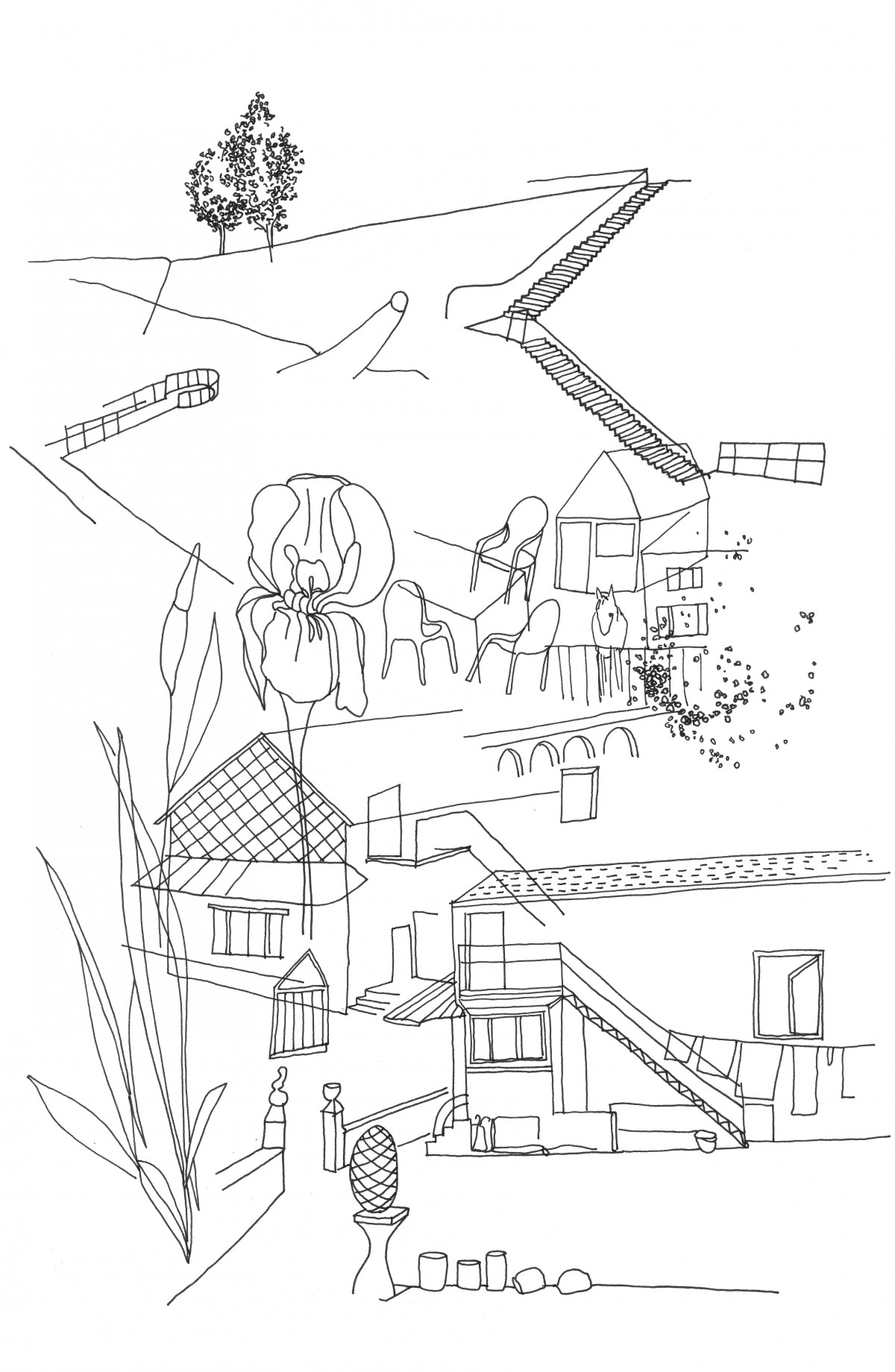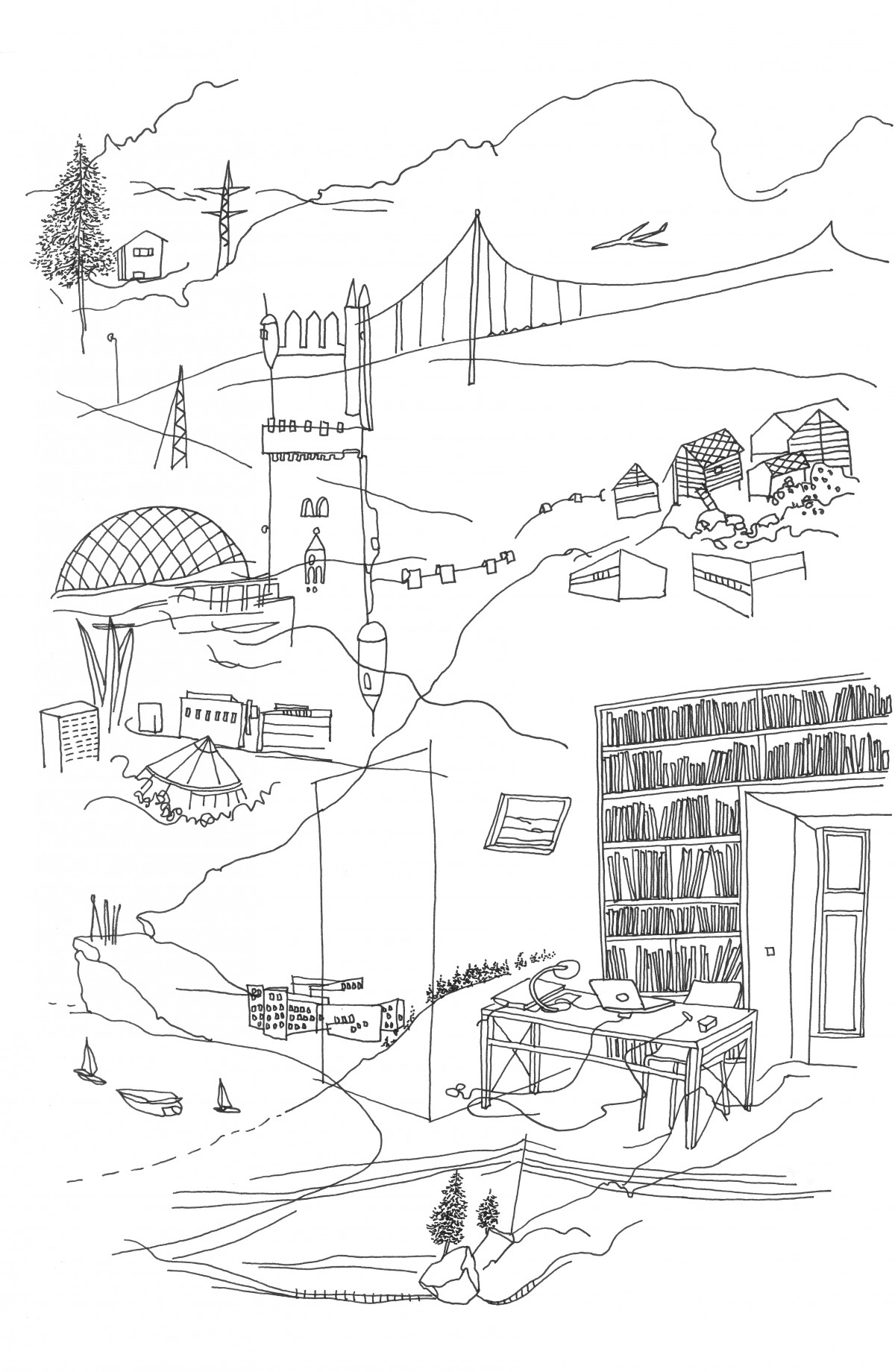 Une longue liste de phrases évoquant des lieux familiers, traversés ou connu a servi de point de départ au travail de dessin. Les représentations d'images mentales des espaces convoqués de la sorte se sont développées à partir de titres suggestifs, treize au total. Lieux qui s'entrecroisent et se superposent ou encore inventaires d'espaces en attente de réappropriation, ce qui permet de créer ainsi de nouvelles histoires, fragmentaires, ouvertes, suggestives.