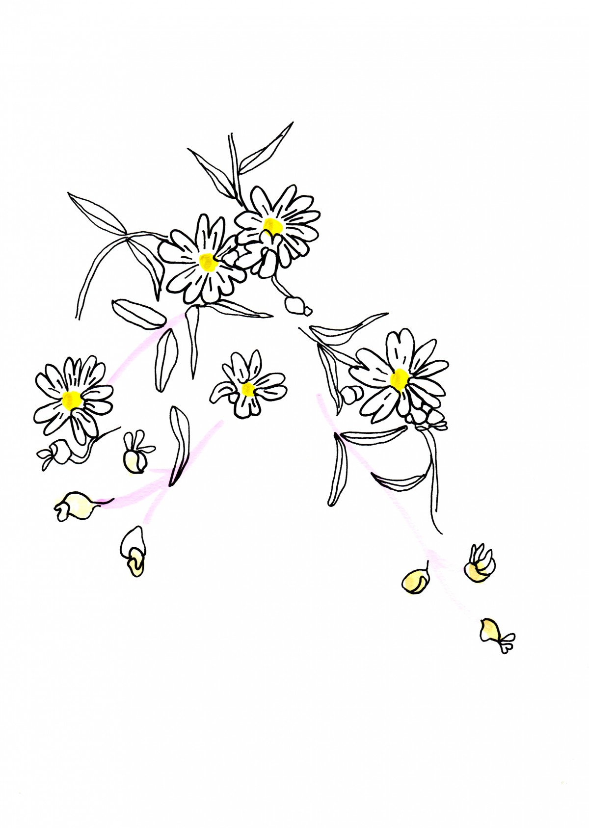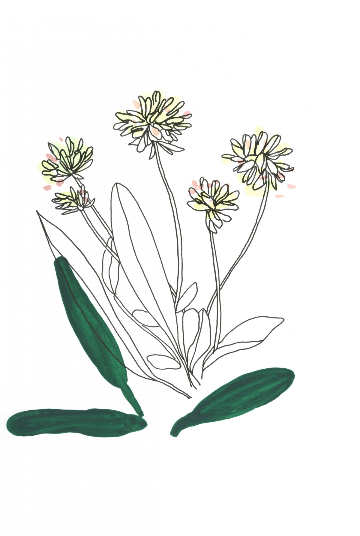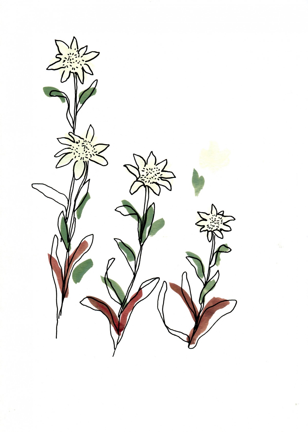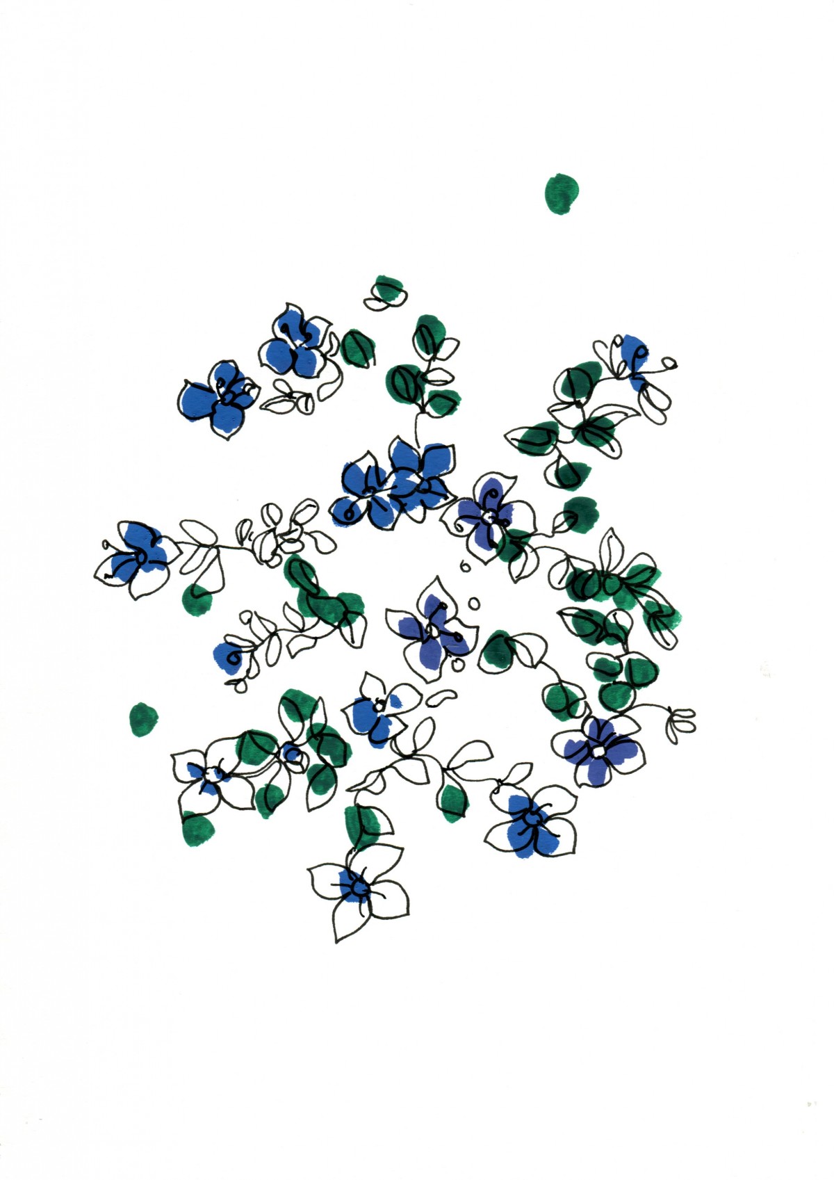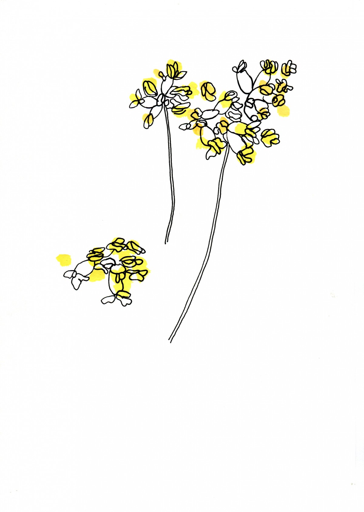 Les dessins de fleurs sont comme une sorte d’herbier surprenant débuté lors d’une résidence artistique à Sion en 2015. Ce travail s’inscrit dans les liens crées entre les randonnées en nature et le dessin. Les fleurs sont photographiées dans leur milieu naturel, puis à partir de ces images, une recherche sur la couleur des fleurs s’effectue comme point de départ. A l’aquarelle, une ou deux nuances de la plante sont déposées sur le papier. Le dessin à la ligne s’inscrit ensuite directement mettant en évidence l’aspect graphique des plantes.Des décalages entre les surfaces colorées et les lignes à l’encre de Chine se produisent donnant à cet «herbier» un caractère singulier.