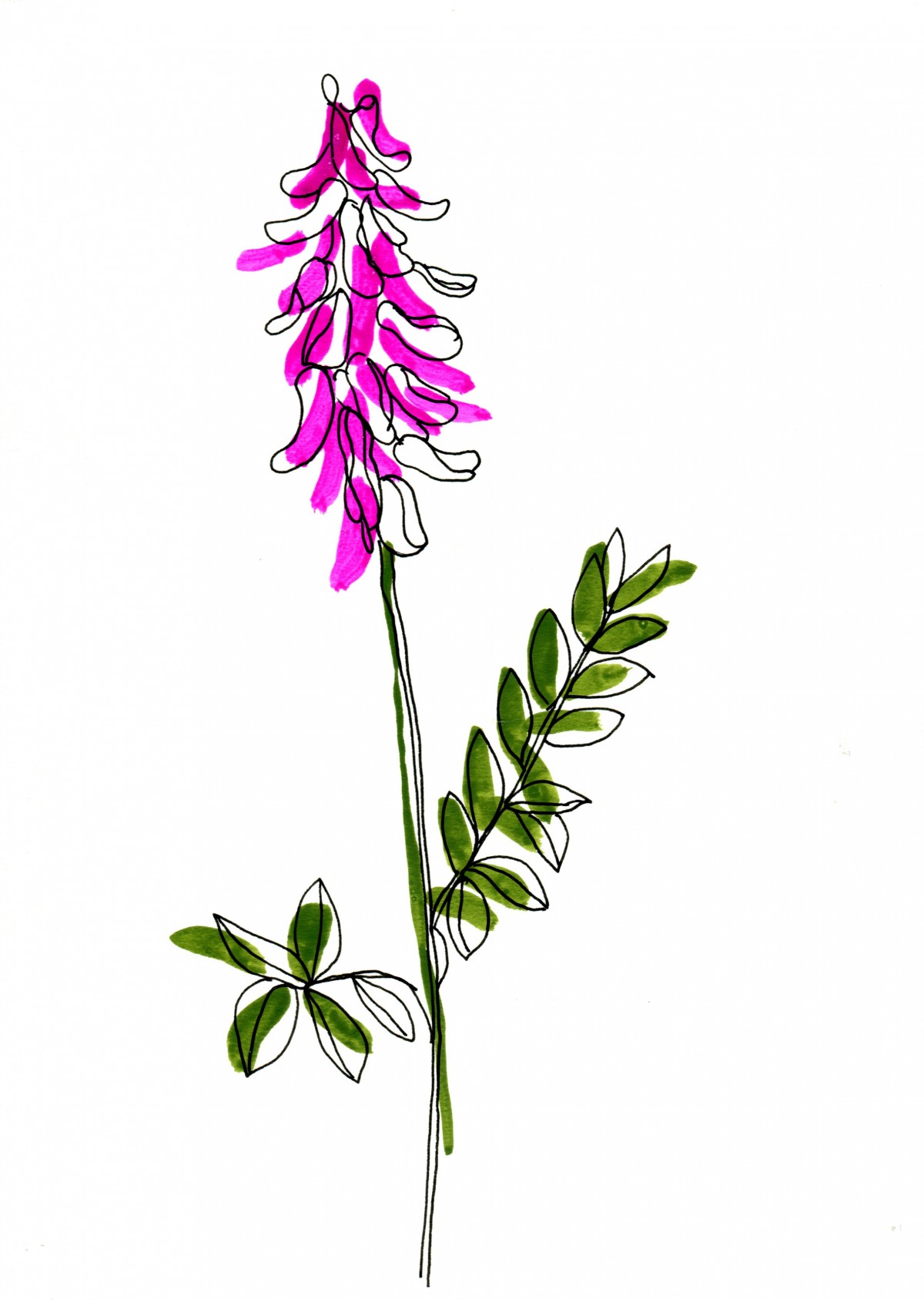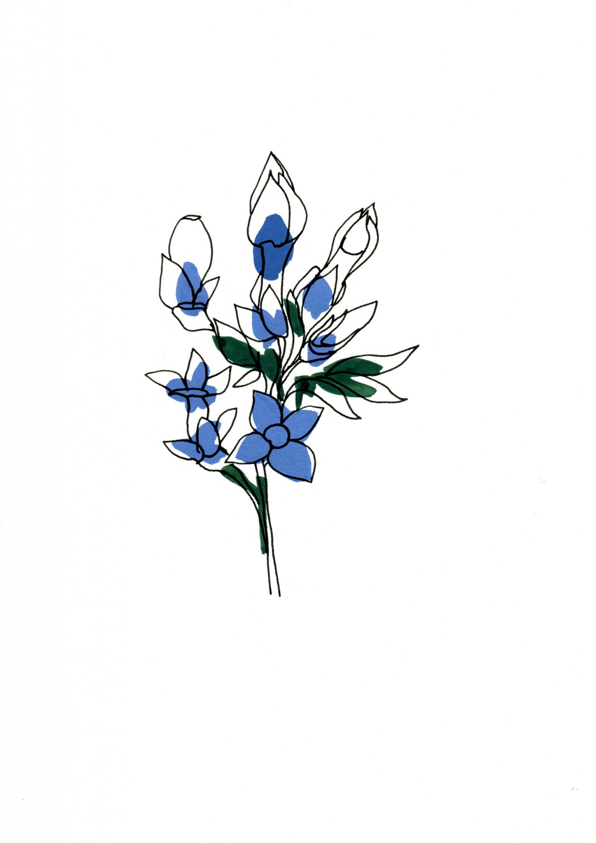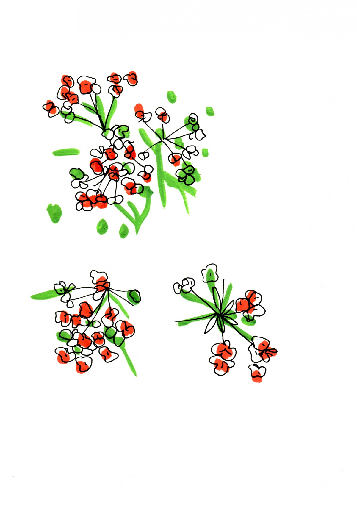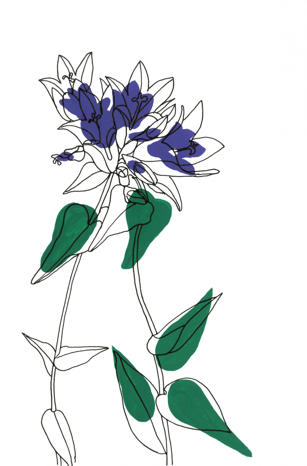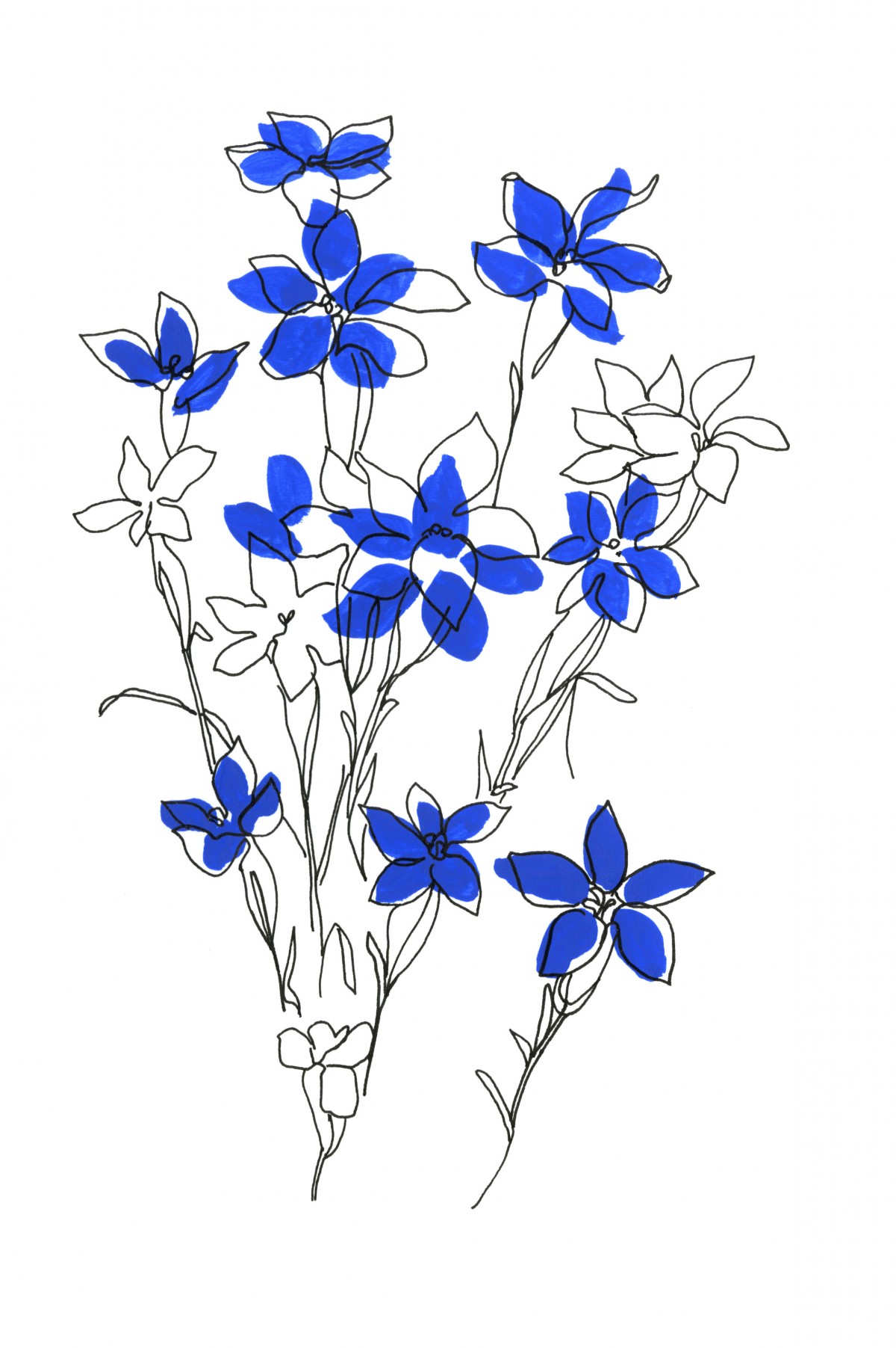 Les dessins de fleurs sont comme une sorte d’herbier surprenant débuté lors d’une résidence artistique à Sion en 2015. Ce travail s’inscrit dans les liens crées entre les randonnées en nature et le dessin. Les fleurs sont photographiées dans leur milieu naturel, puis à partir de ces images, une recherche sur la couleur des fleurs s’effectue comme point de départ. A l’aquarelle, une ou deux nuances de la plante sont déposées sur le papier. Le dessin à la ligne s’inscrit ensuite directement mettant en évidence l’aspect graphique des plantes.Des décalages entre les surfaces colorées et les lignes à l’encre de Chine se produisent donnant à cet «herbier» un caractère singulier.