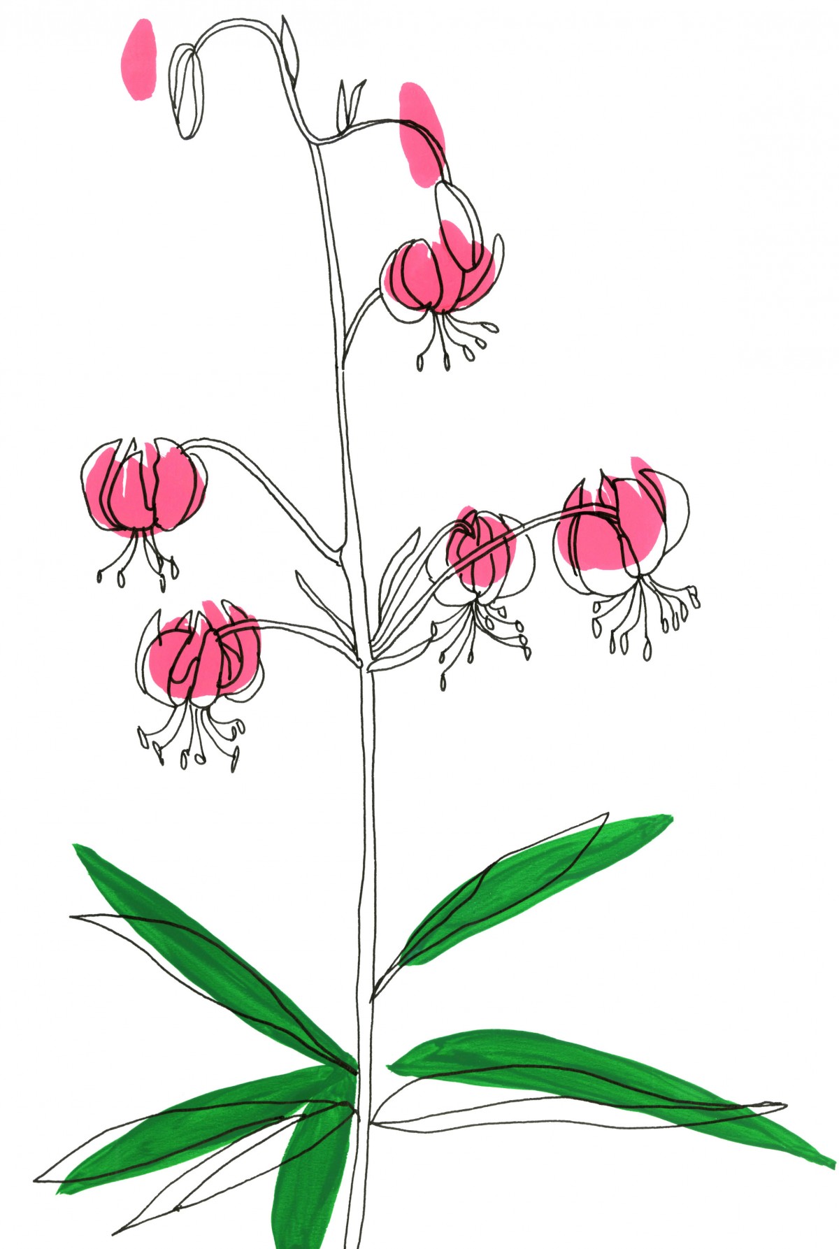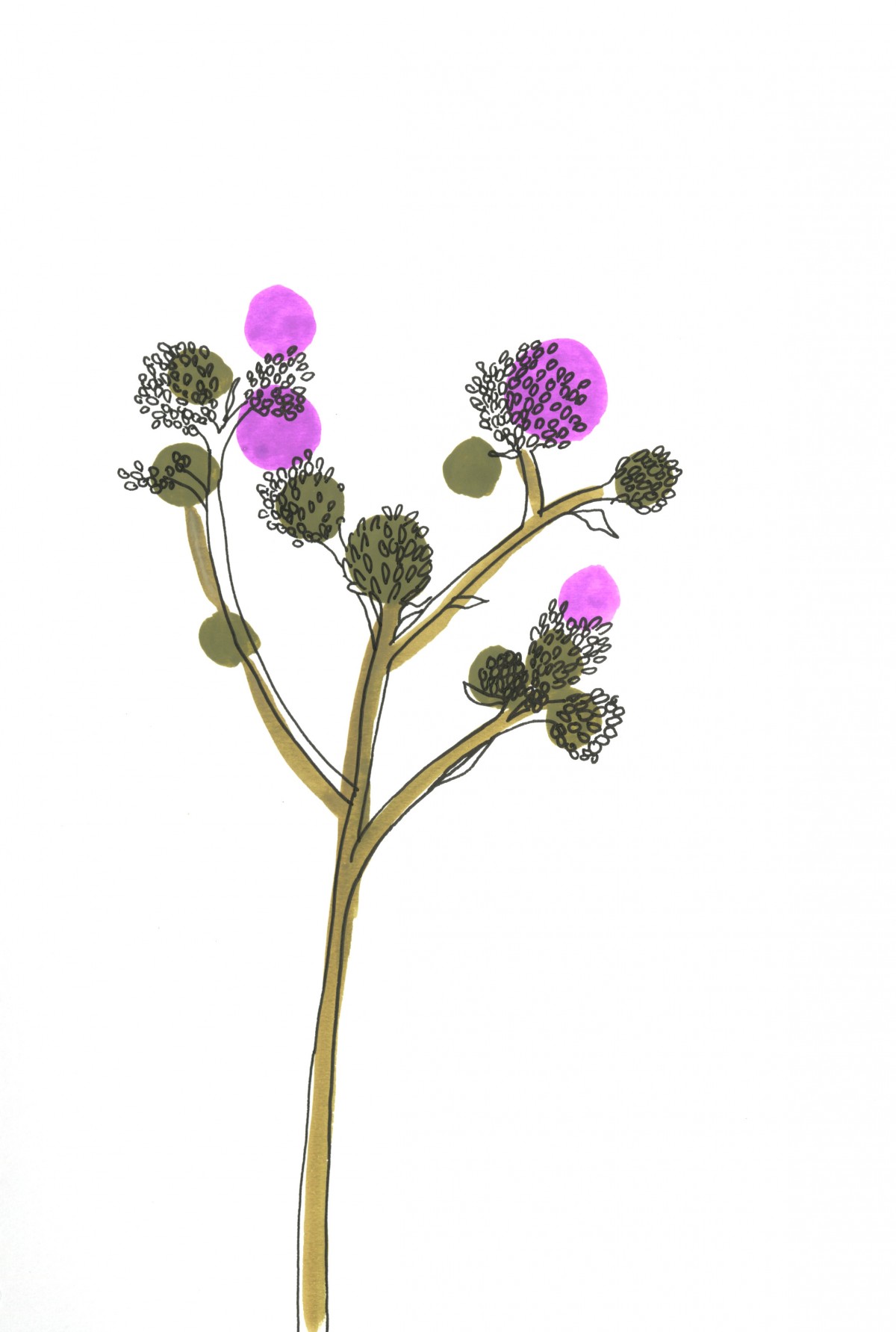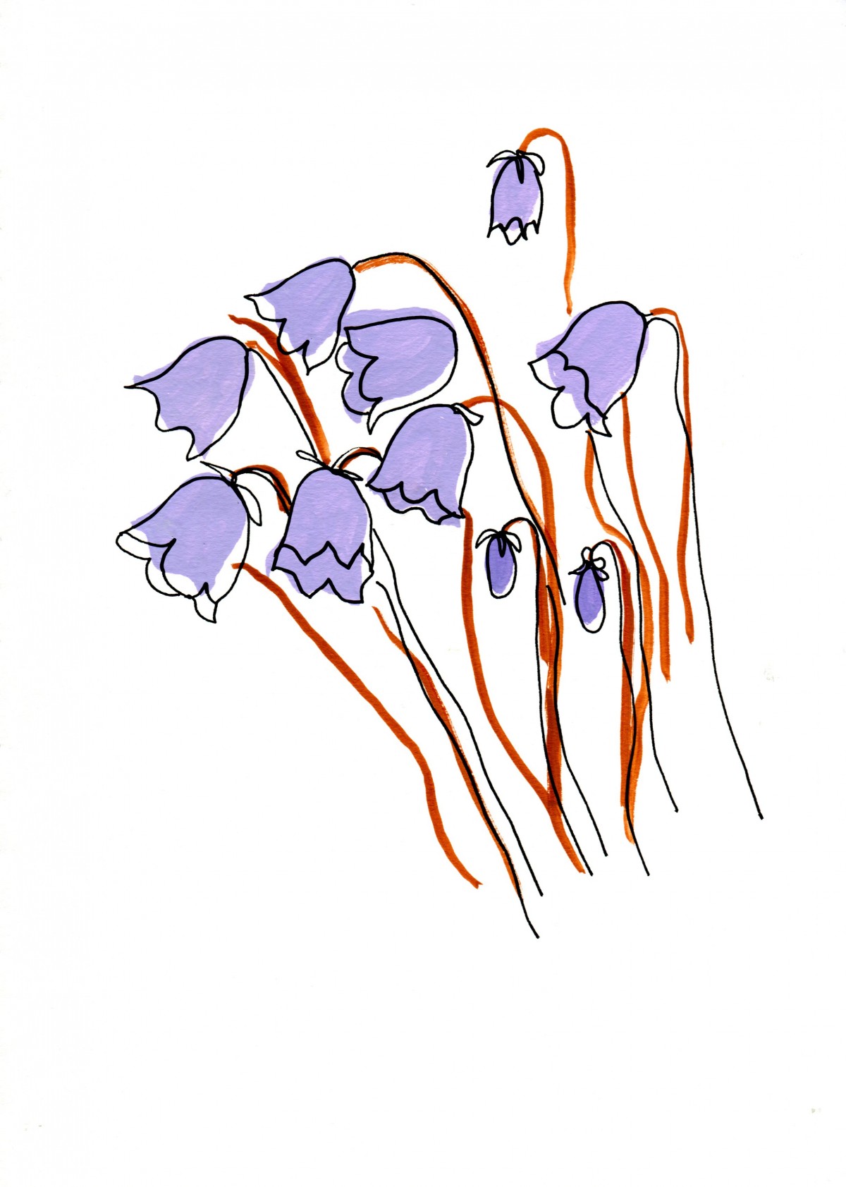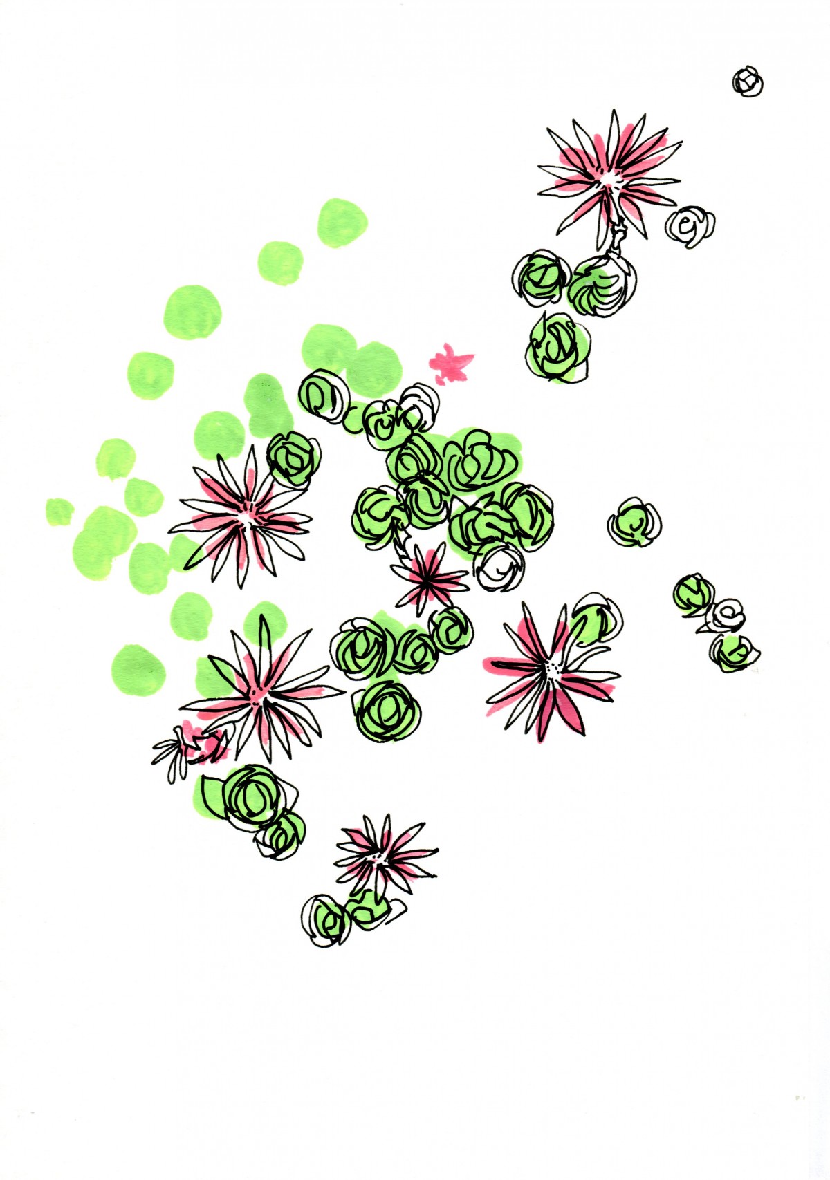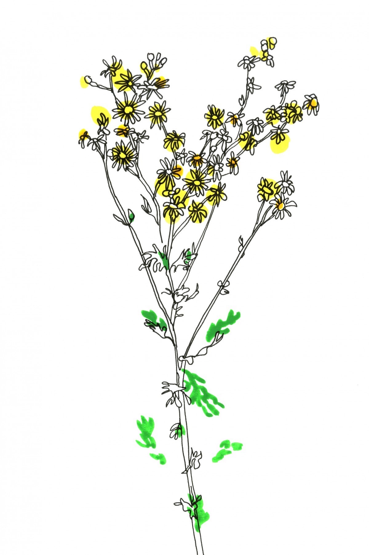 Les dessins de fleurs sont comme une sorte d’herbier surprenant débuté lors d’une résidence artistique à Sion en 2015. Ce travail s’inscrit dans les liens crées entre les randonnées en nature et le dessin. Les fleurs sont photographiées dans leur milieu naturel, puis à partir de ces images, une recherche sur la couleur des fleurs s’effectue comme point de départ. A l’aquarelle, une ou deux nuances de la plante sont déposées sur le papier. Le dessin à la ligne s’inscrit ensuite directement mettant en évidence l’aspect graphique des plantes.Des décalages entre les surfaces colorées et les lignes à l’encre de Chine se produisent donnant à cet «herbier» un caractère singulier.