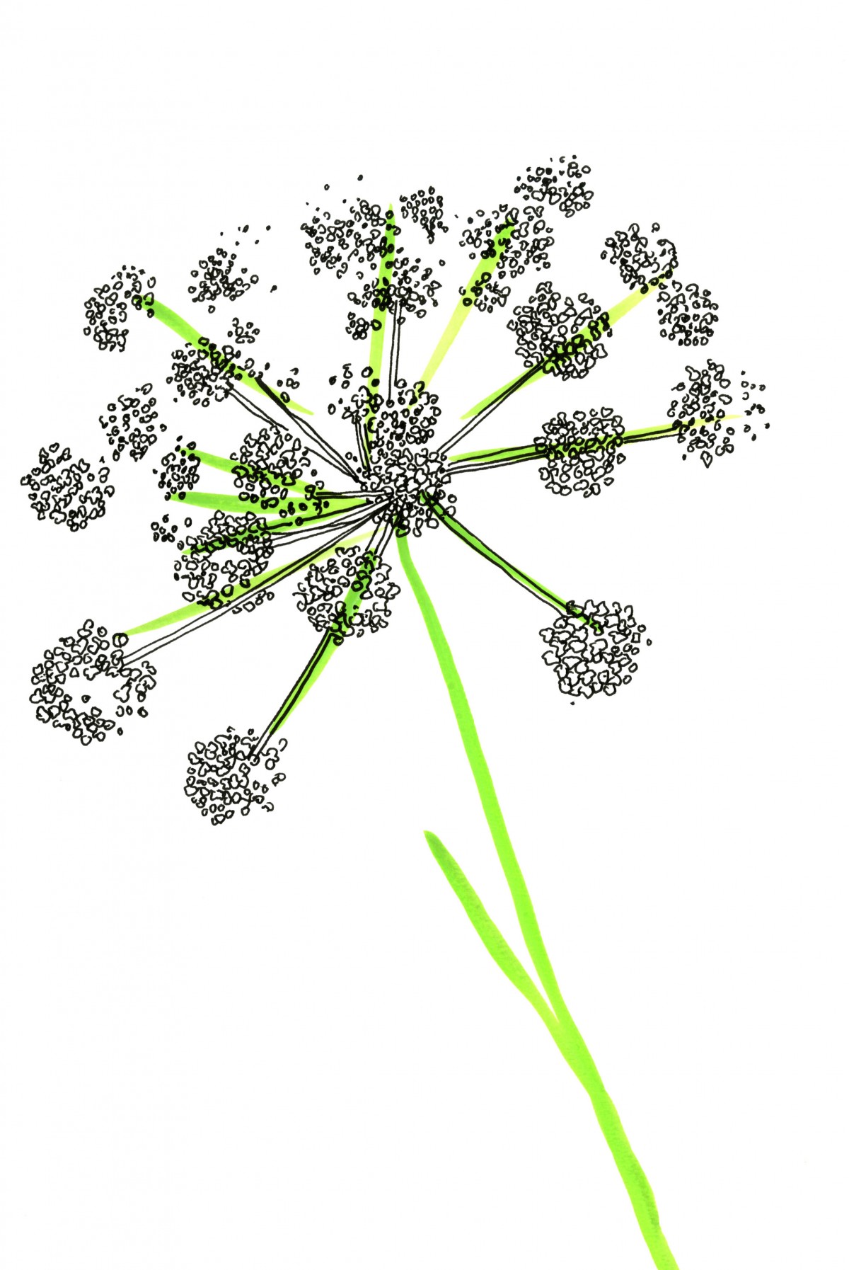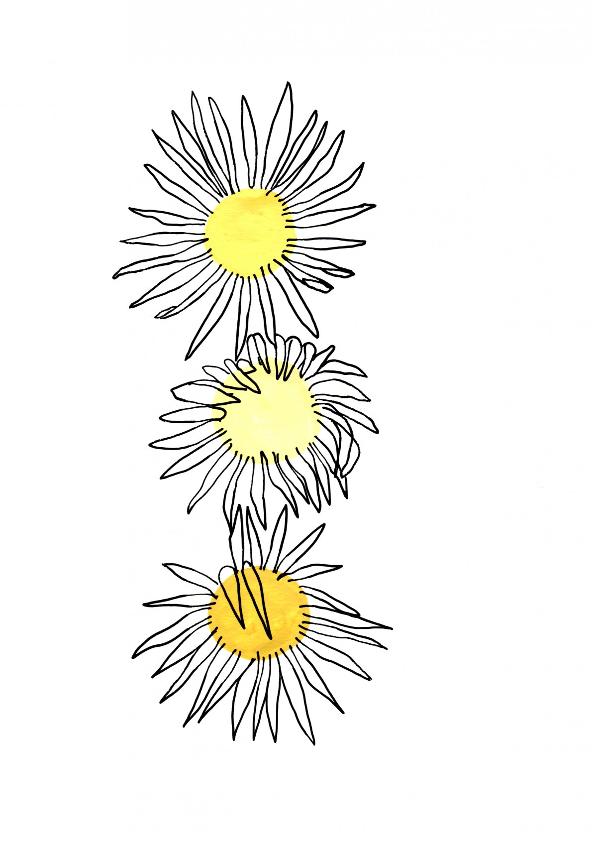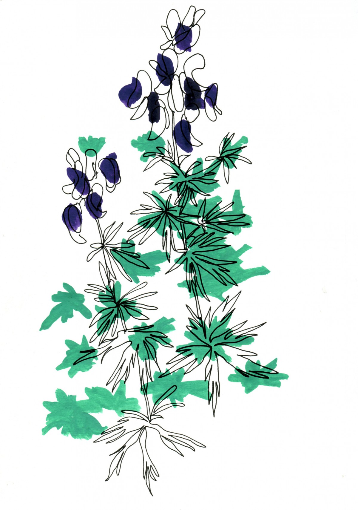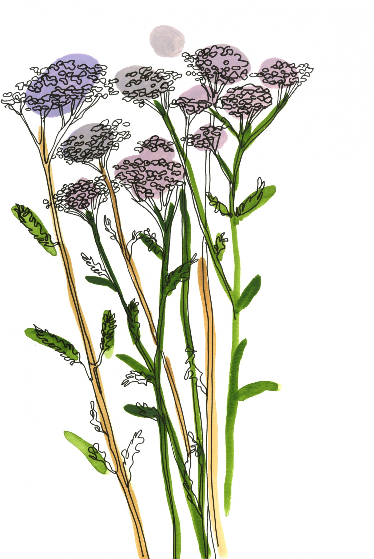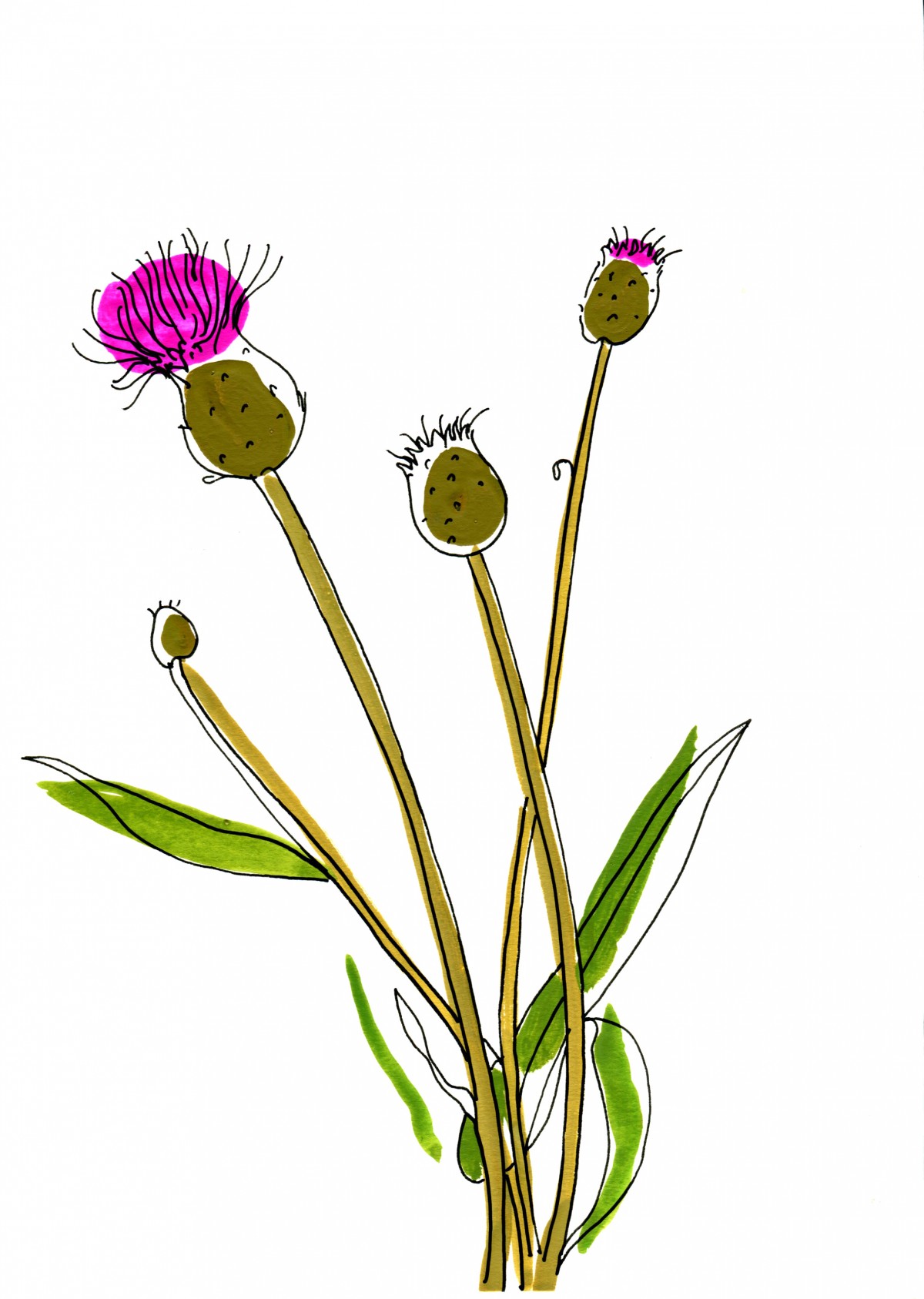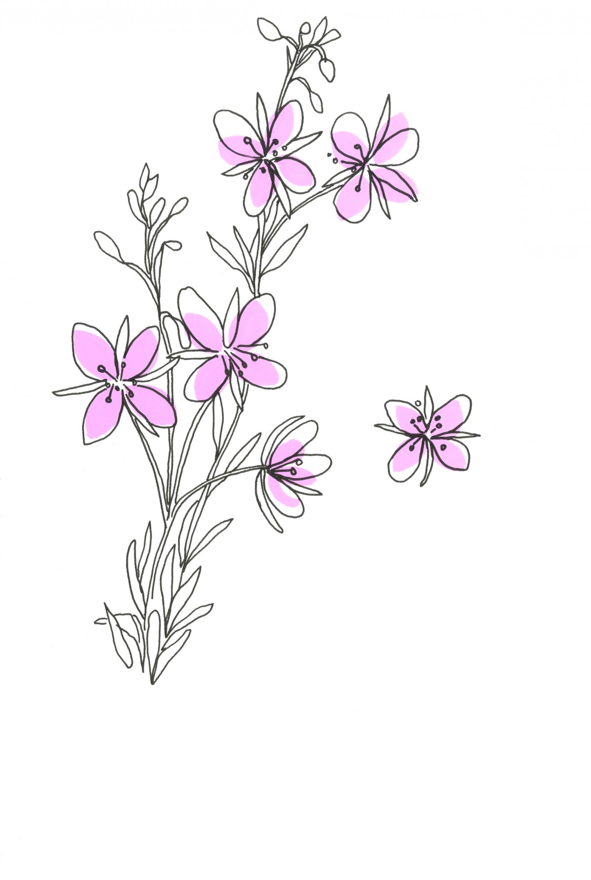 Les dessins de fleurs sont comme une sorte d’herbier surprenant débuté lors d’une résidence artistique à Sion en 2015. Ce travail s’inscrit dans les liens crées entre les randonnées en nature et le dessin. Les fleurs sont photographiées dans leur milieu naturel, puis à partir de ces images, une recherche sur la couleur des fleurs s’effectue comme point de départ. A l’aquarelle, une ou deux nuances de la plante sont déposées sur le papier. Le dessin à la ligne s’inscrit ensuite directement mettant en évidence l’aspect graphique des plantes.Des décalages entre les surfaces colorées et les lignes à l’encre de Chine se produisent donnant à cet «herbier» un caractère singulier.