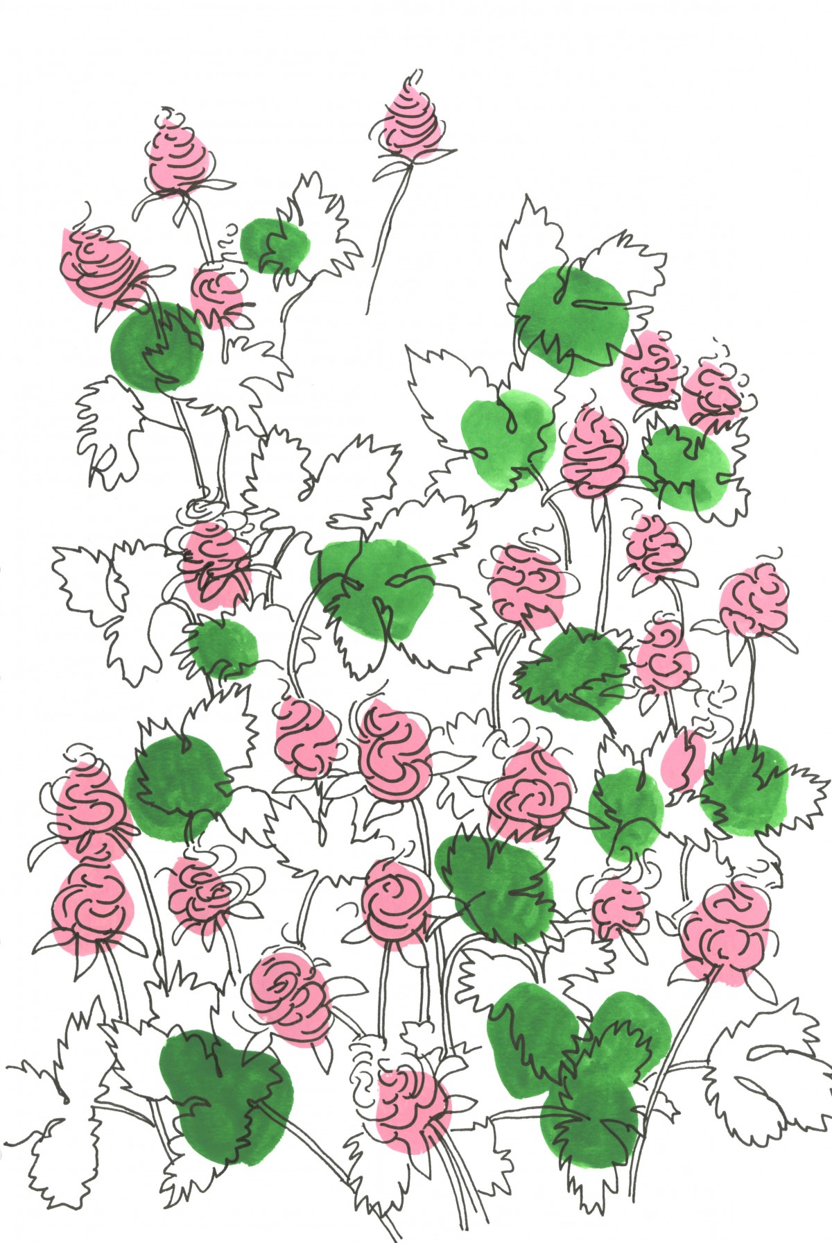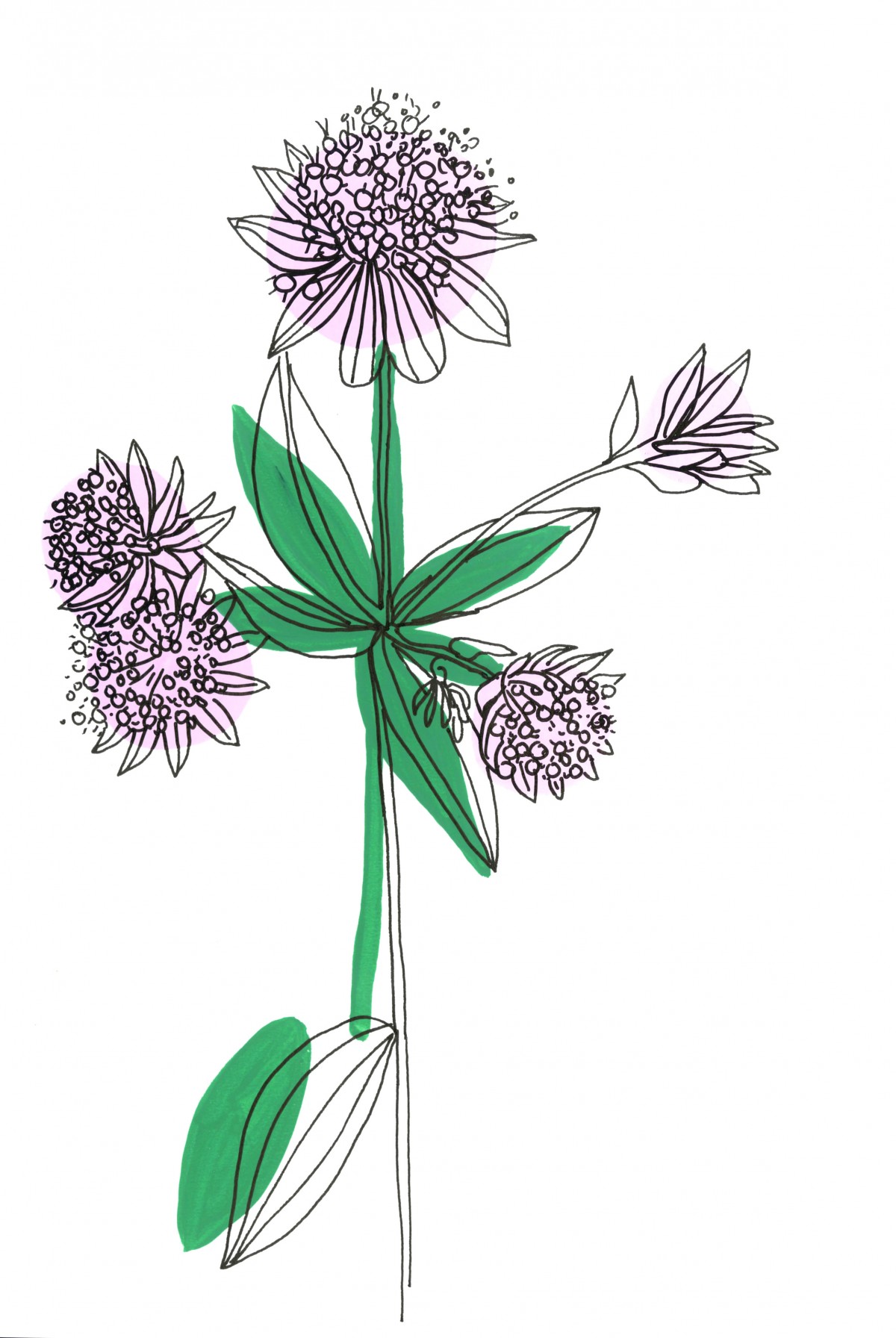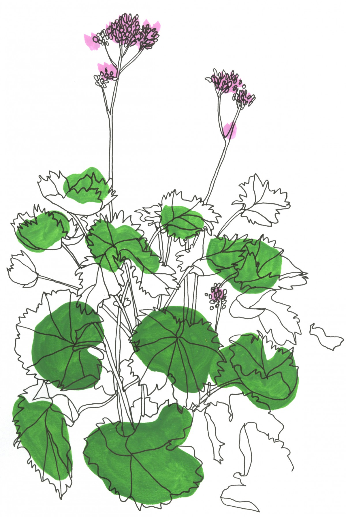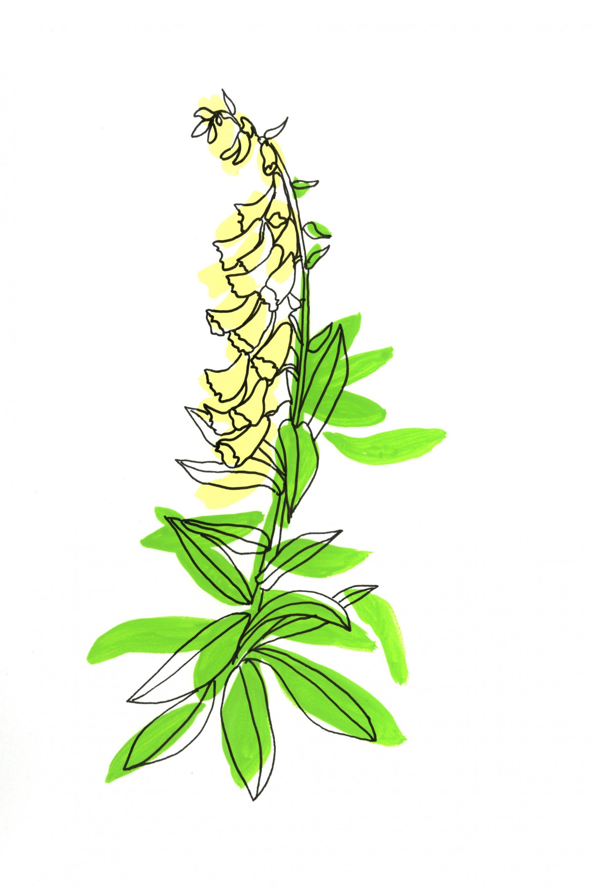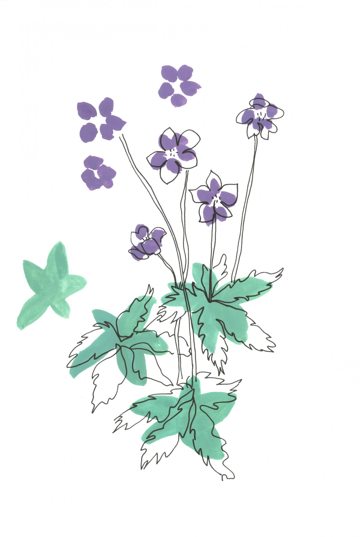 Les dessins de fleurs sont comme une sorte d’herbier surprenant débuté lors d’une résidence artistique à Sion en 2015. Ce travail s’inscrit dans les liens crées entre les randonnées en nature et le dessin. Les fleurs sont photographiées dans leur milieu naturel, puis à partir de ces images, une recherche sur la couleur des fleurs s’effectue comme point de départ. A l’aquarelle, une ou deux nuances de la plante sont déposées sur le papier. Le dessin à la ligne s’inscrit ensuite directement mettant en évidence l’aspect graphique des plantes.Des décalages entre les surfaces colorées et les lignes à l’encre de Chine se produisent donnant à cet «herbier» un caractère singulier.