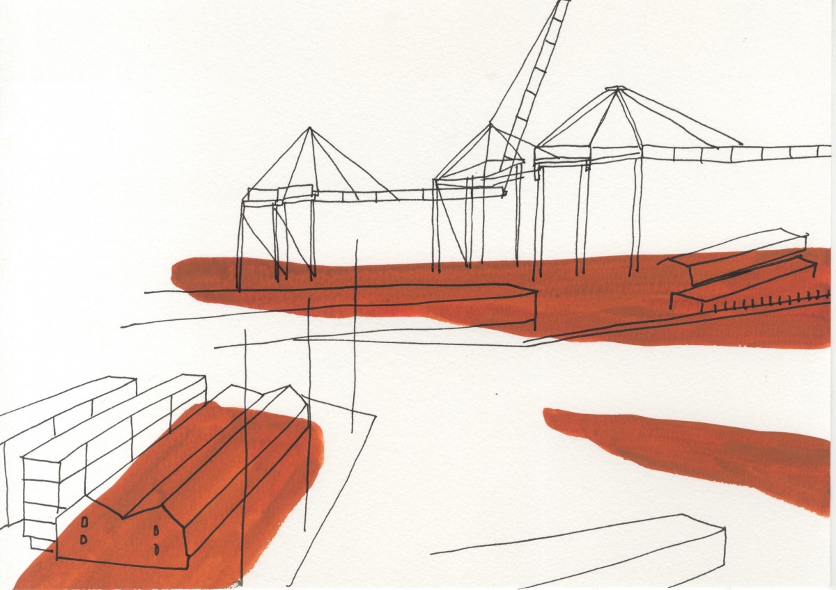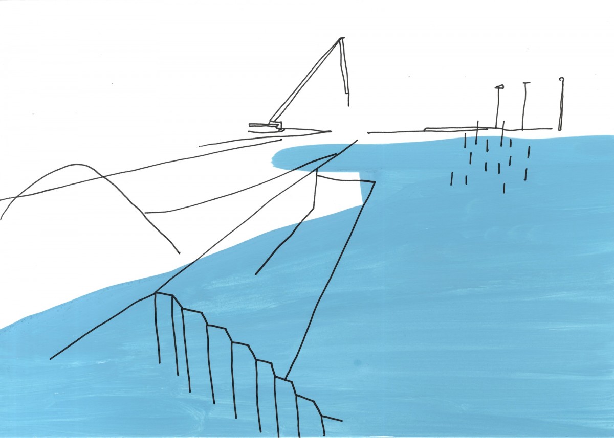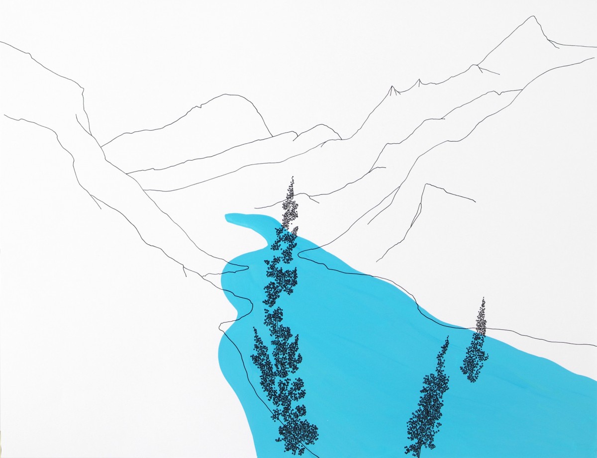 En relation avec les formes colorées peintes en aplat, des lignes dessinent le paysage en construisant des volumes et ouvrant des perspectives. Les compositions sobres ménagent l’expression des tracés, laissant ainsi une certaine liberté d’interprétation afin de susciter des réminiscences. Entre ces deux éléments graphiques – forme-ligne –, des décalages se produisent, soulignant de cette manière des rapports de temporalités différentes ; geste du dessin, rapide et lent à la fois, mais aussi temps plus infini de la nature où, souvent, les transformations de l’érosion demeurent invisibles, si ce n’est la vision d’éboulements qui se sont produits dans le passé.