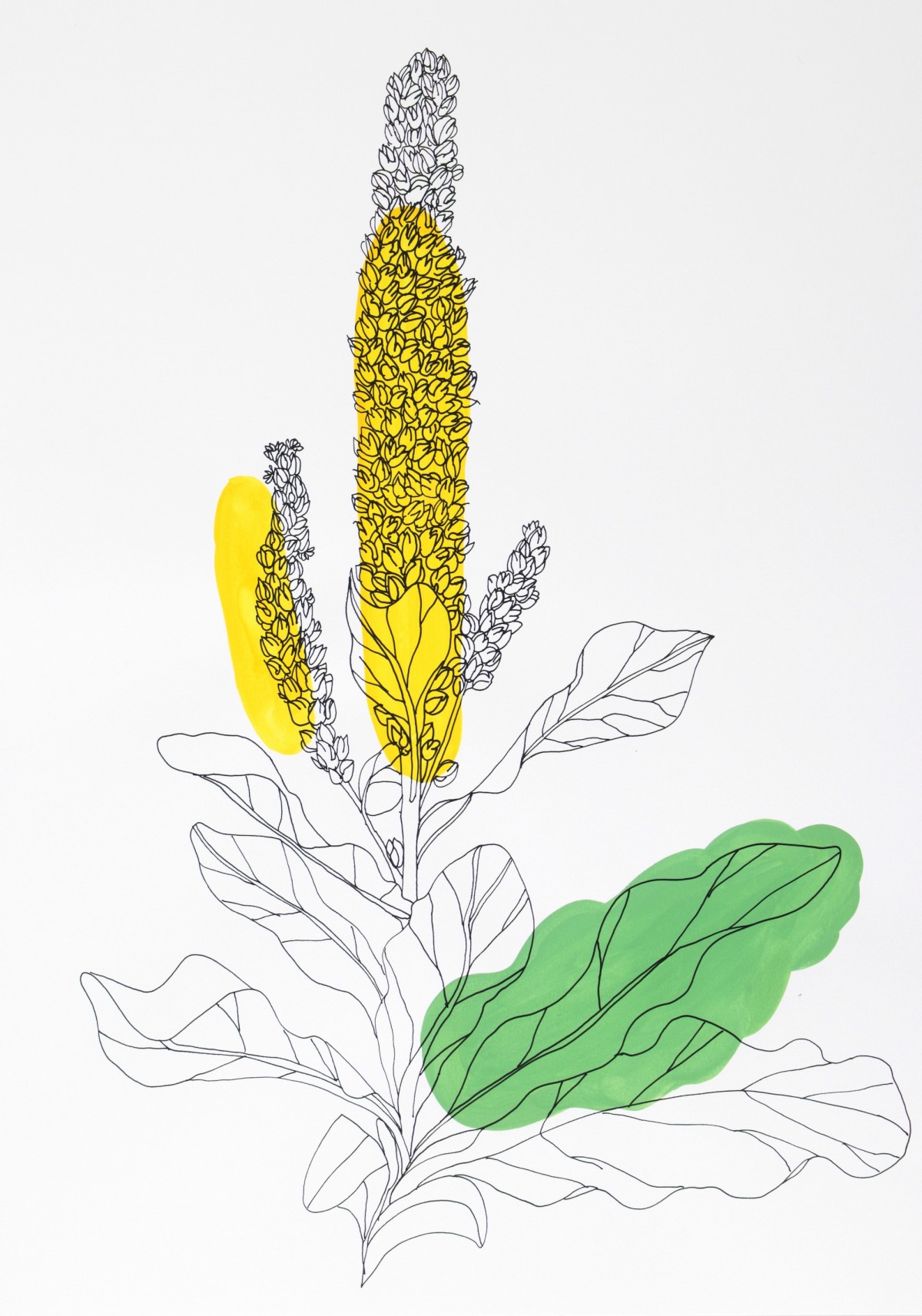 Pour l’exposition Nuances, les tracés à l’encre de Chine se mêlent à une ou deux formes colorées, – initialement déposées sur la surface du papier – comme élément déclencheur. Sorte d’indice minimal de notre monde polychrome, le choix des couleurs issu d’une recherche entre réalité et mémoire concentre ainsi ses qualités évocatrices. L’ensemble des dessins présentés suggérant des variations illimitées.