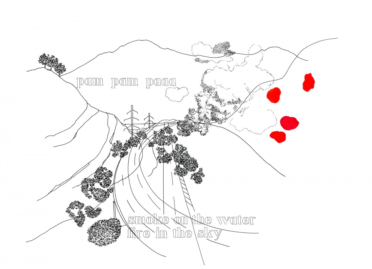 Ces événements peuvent être des coïncidences, des expériences hasardeuses, comme des questionnements sur le paysage. Deux chansons, entendues une à la radio en conduisant et l'autre sur la terrasse d’un bar d’une station de sport d’hiver, – Smoke on the water de Deep purple, et Personal Jesus de Depeche Mode –, font écho aux paysages traversés. Pour la première, il s'agit du Lavaux dont un coucher de soleil embrase justement le ciel. Quant à la chanson Personal Jesus reprise par Johnny Cash entendue l'été à Flaine, je l’ai immédiatement reliée au contexte de la station où la religion du divertissement détourne les paysages naturels et architecturaux en terrains de jeux.