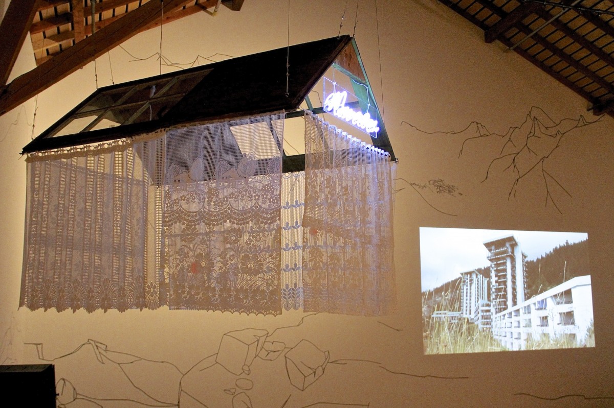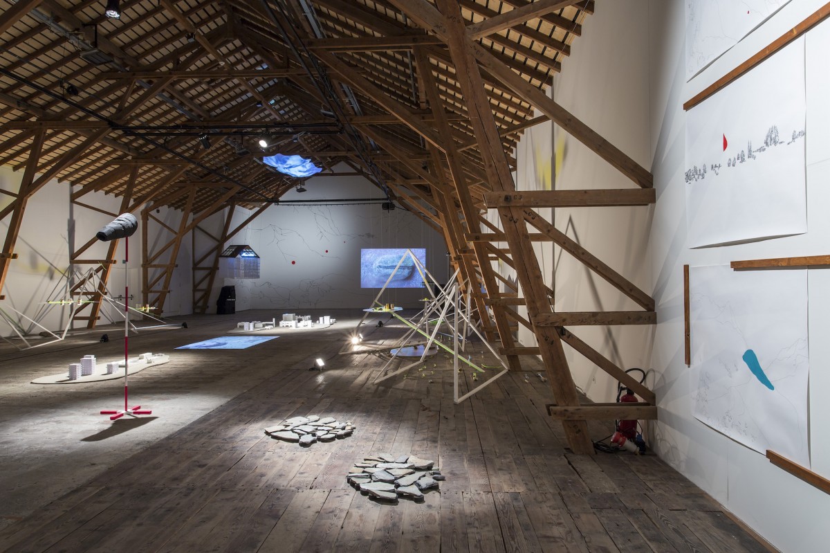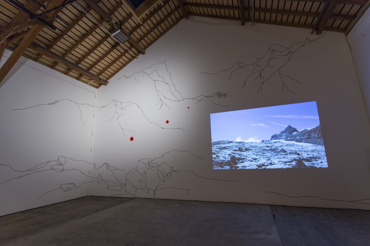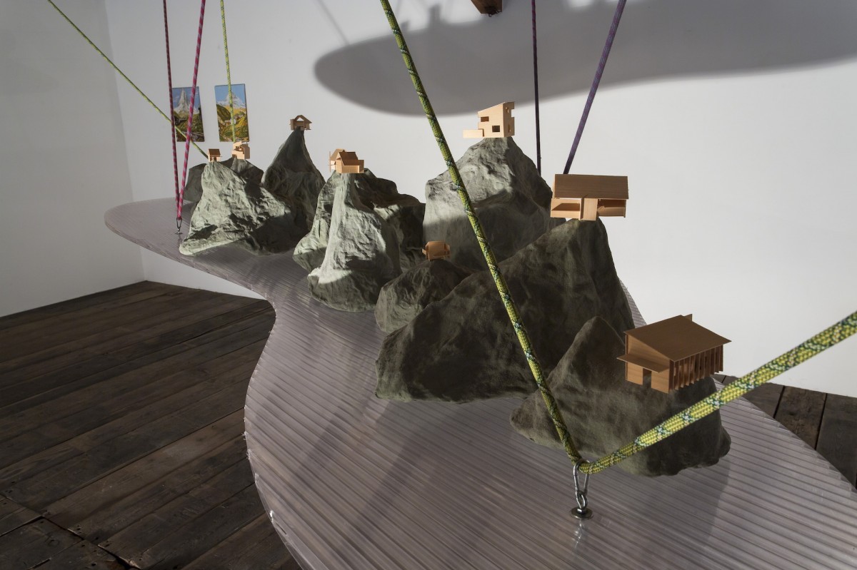 « Le point de départ est une résidence de trois mois à la Ferme-Asile de Sion. Le résultat est l’investissement de la grange, un vaste espace d’exposition de 800m2. Le duo d’artistes installé à Genève a profité de l’invitation estivale pour sillonner le Valais en voiture, en train, en car postal, à vélo et à pied, pour observer, filmer, dessiner et collecter des objets. Ces emprunts tirés de la réalité apparaissent dans l’installation comme des ancrages vécu. Cailloux, coquilles d’escargots, fragments de briques, plumes d’oiseaux, mais aussi brosses à dents, planche de skate, raquette de badminton, sac à dos, cordes d’alpinismes, le plus souvent détournés avec humour, servent de contrepoint au ressenti de leur expérience. L’expression des souvenirs d’une émotion, que ce soit lors d’échange avec les habitants, des impressions visuelles comme le va-et-vient du regard qui passe des hauteurs montagneuses à la plaine du Rhône, l’observation des paysages, l’écoute des sons, la contemplation de la douceur du mouvement de l’eau, le passage soudain et bruyant d’un avion militaire, est ce qui distingue les deux artistes qui travaillent régulièrement ensemble depuis 2011.