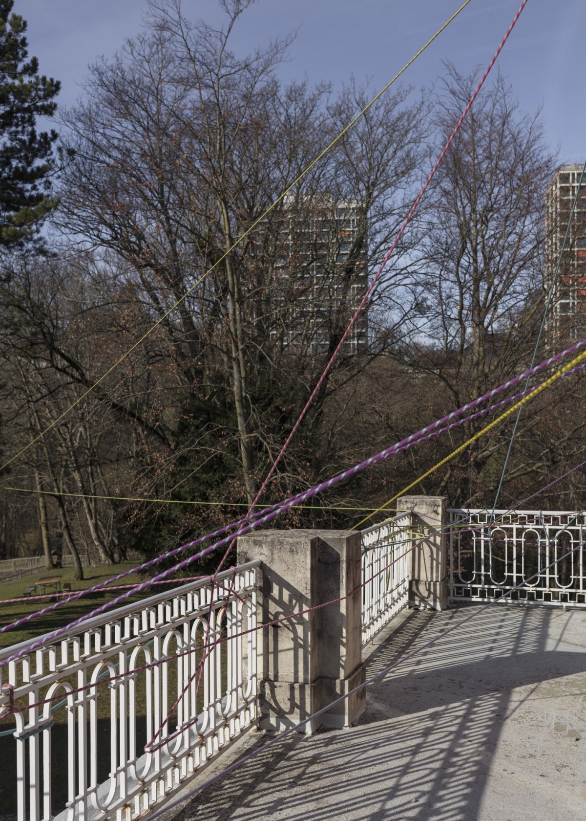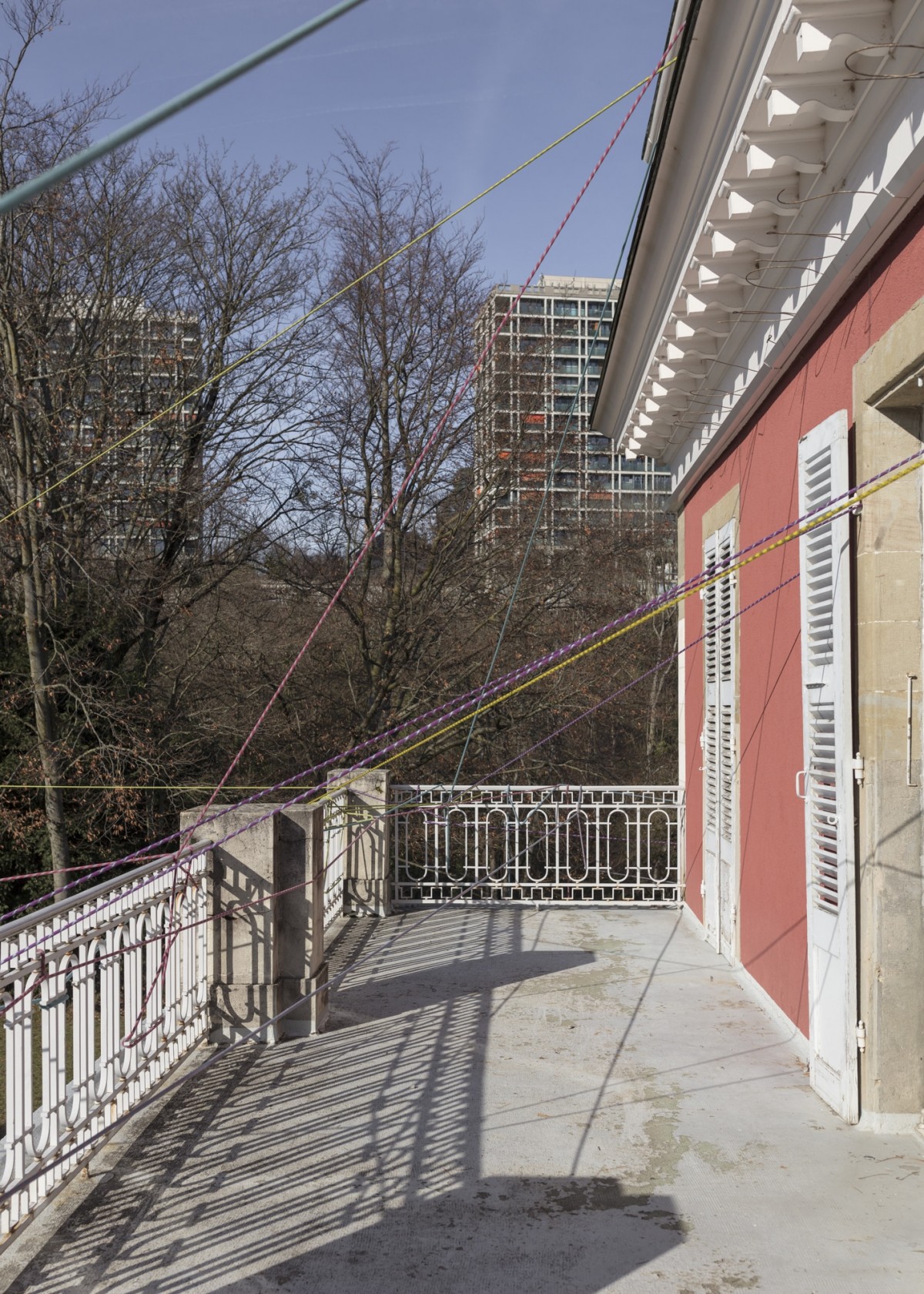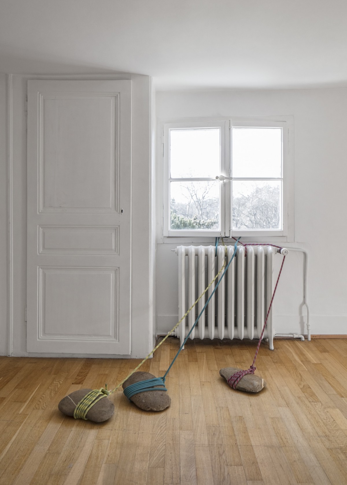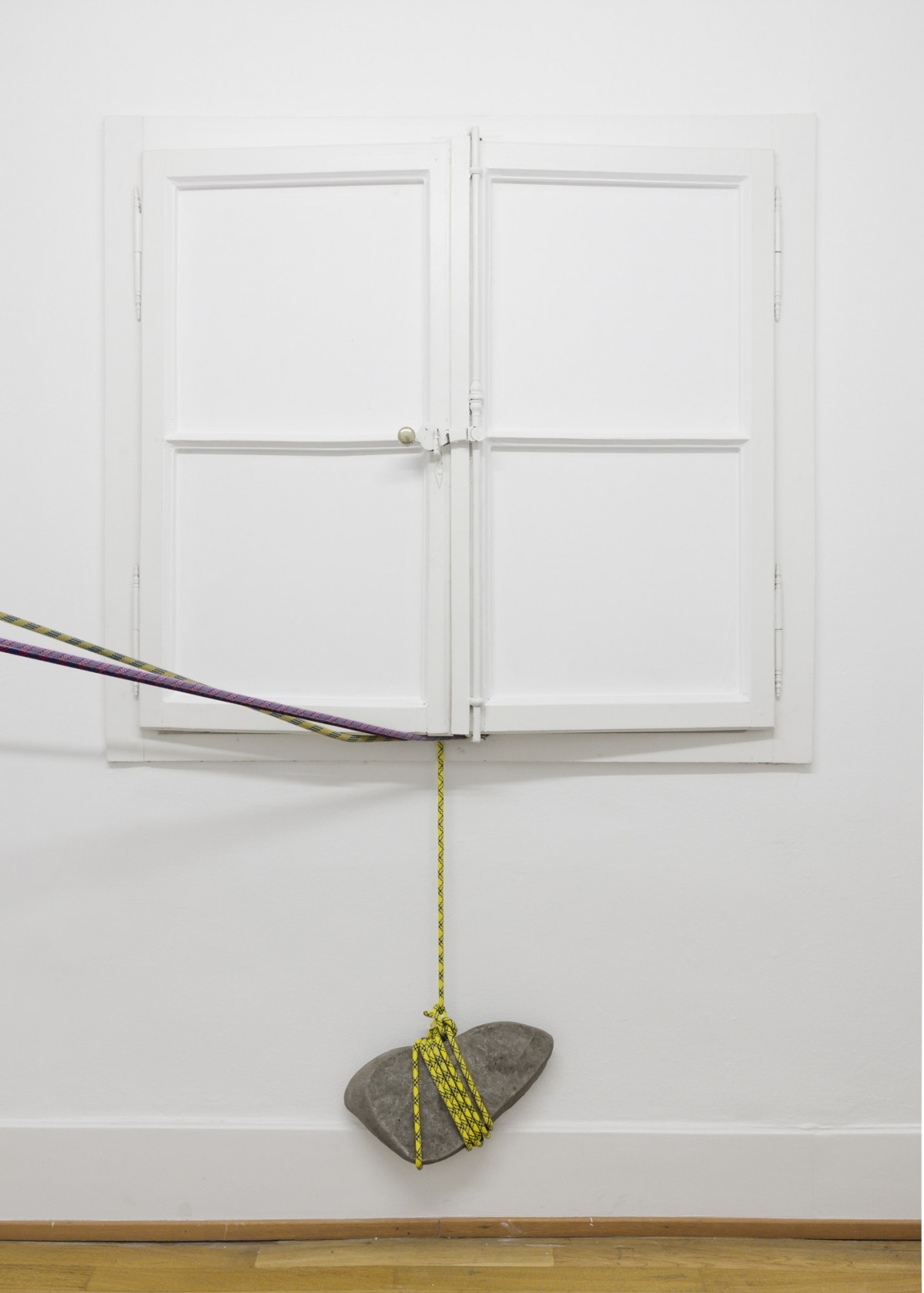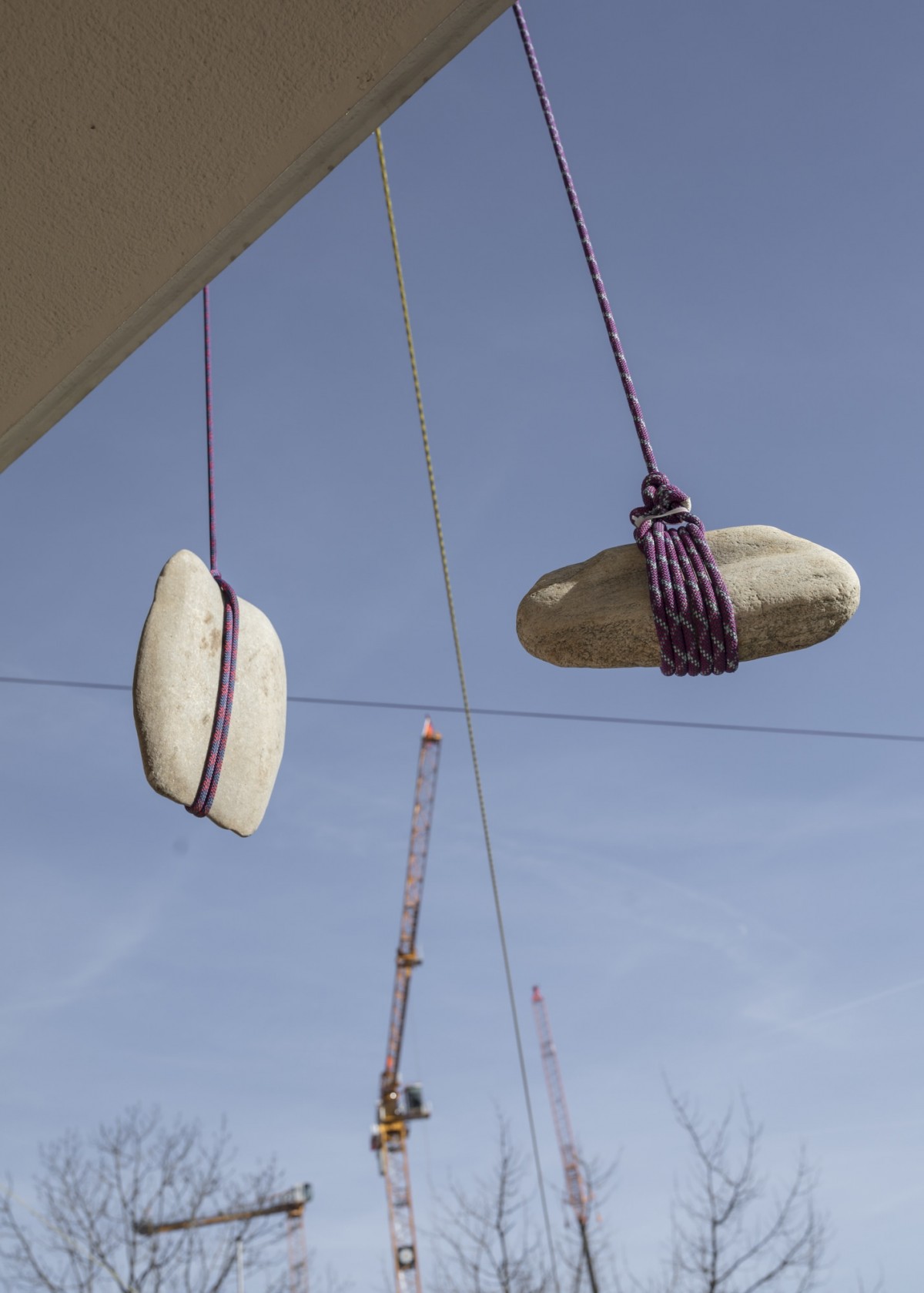 Sur les thèmes de la tension et de la « dis-corde », Pascale Favre et Thomas Schunke se servent de cordages d’alpinisme et des pierres pour créer des foyers qui se déploient dans les espaces d’exposition et d’autres plus intermédiaires avant de s’échapper par les fenêtres de la maison. Par ces liens, les différentes pièces sont réunies et reliées à l’extérieur de la Villa. Attachées au bout de ces cordes, les pierres servent à la fois d’amarrage tout en assumant l’aspect de fugitifs. On retrouve dans le concept de cette œuvre créée in situ à la fois la rigueur architecturale de Pascale Favre et l’humour décalé de Thomas Schunke, avec un clin d’œil à ses performances musicales, comme les pierres utilisées sont dotées de cette qualité.