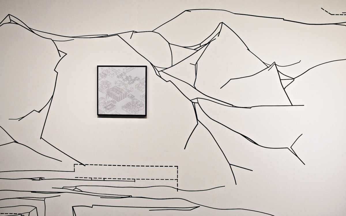 Agencements se compose d'une installation au sol et d'un dessin mural suggérant des paysages naturels et urbains où les points de vue possibles se démultiplient.