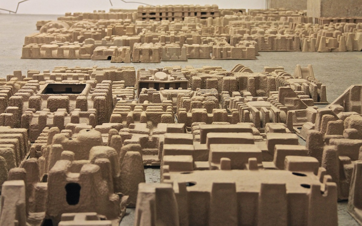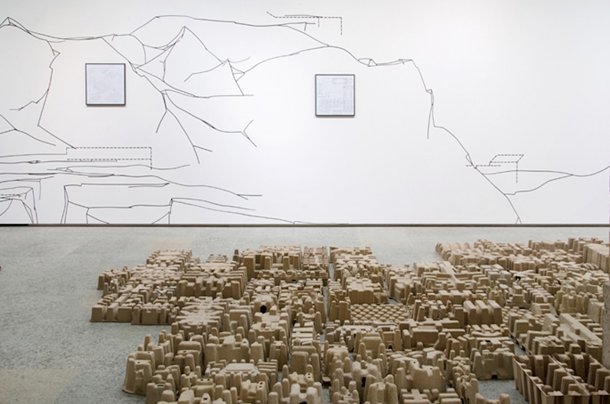 Des boîtes sont disposées à même le sol. Il s'agit de cartons moulés qui protègent les appareils électroniques, les cartouches d'imprimantes, etc. Ces éléments recueillis au hasard des trouvailles le soir et le matin avant la relève hebdomadaire des vieux papiers constituent une sorte de collection engagée cinq ans avant l'exposition. Isolés, les éléments sont des objets sans valeur sculpturale particulière, mais installés ensemble, ils évoquent la projection d'une ville. Le jeu des combinaisons urbanistiques s'étend de telle manière qu'il permet au regard de se perdre en plongeant directement dans les diverses structures architectoniques. L'ensemble de la maquette au sol est en relation avec un dessin mural qui l'enveloppe en même temps qu'il suggère une ouverture. C'est un environnement rappelant divers paysages qui se combinent. Les traits noirs façonnent des perspectives transformant les surfaces blanches des cimaises en une sorte d'infini. La maquette vue du dessus et le dessin regardé de face proposent au spectateur des situations de point de vue en mouvement.