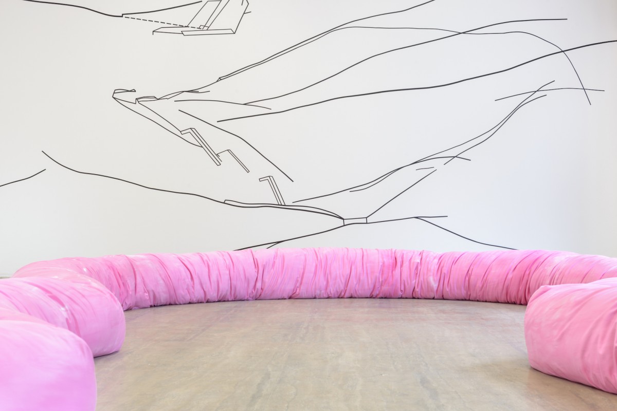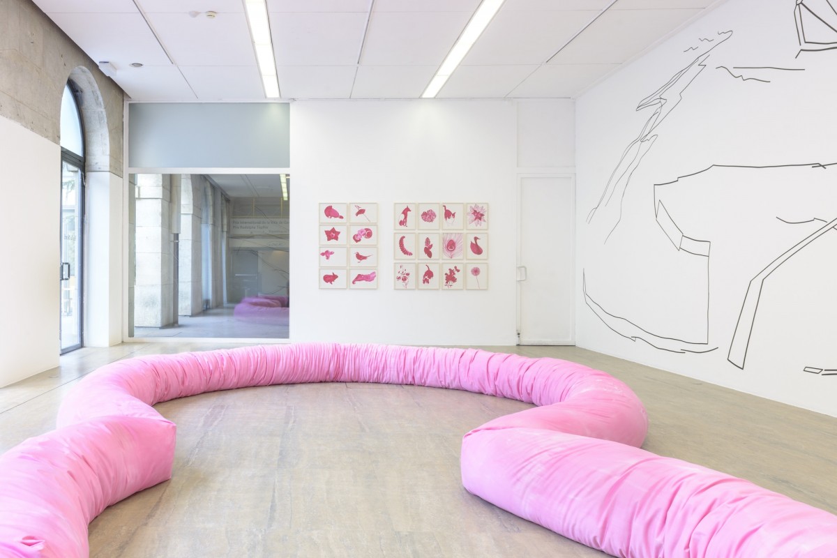 Figurations intérieures | Installé sur le sol, un tube en tissu – présence physique – détermine un espace plus confiné. Par sa texture et sa forme il se réfère à l’organe invisible de l’extérieur mais également au plan d’une proto-architecture. L’habitation-organique vue autant comme une protection qu’un réceptacle est peinte en rose car s’il est vrai que cette couleur se rapproche de la chair elle rend aussi compte du floral et du féminin.