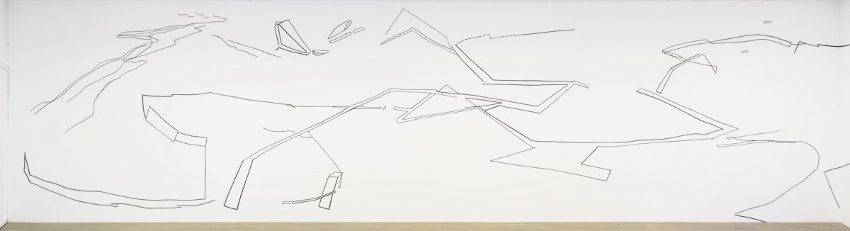 Lignes intérieures | Le lacis de lignes libres et multiples, fragmentées ou continues, dessinent des sortes de paysages qui abolissent matérialité et verticalité des murs. Ceux-ci deviennent le support d’une transformation possible, d’un espace ouvert par des tracés qui fuient et des perspectives qui se déploient en surface. Indices de réseaux et de formes qui révèlent une activité mentale plus que l’image d’un panorama immédiatement reconnaissable. Esquisse sans mesure d’une expression de la pensée qui raconterait en même temps la fugacité et l’accomplissement d’une idée.